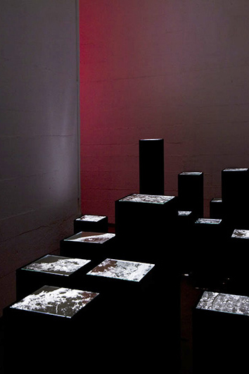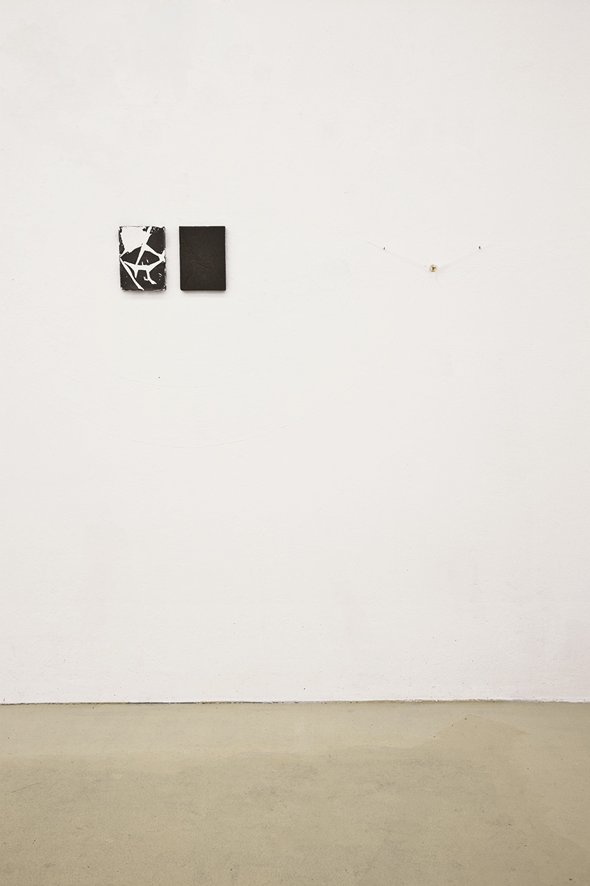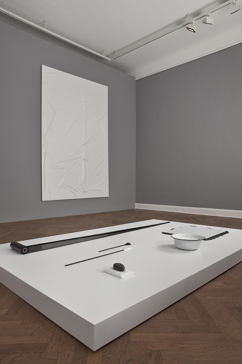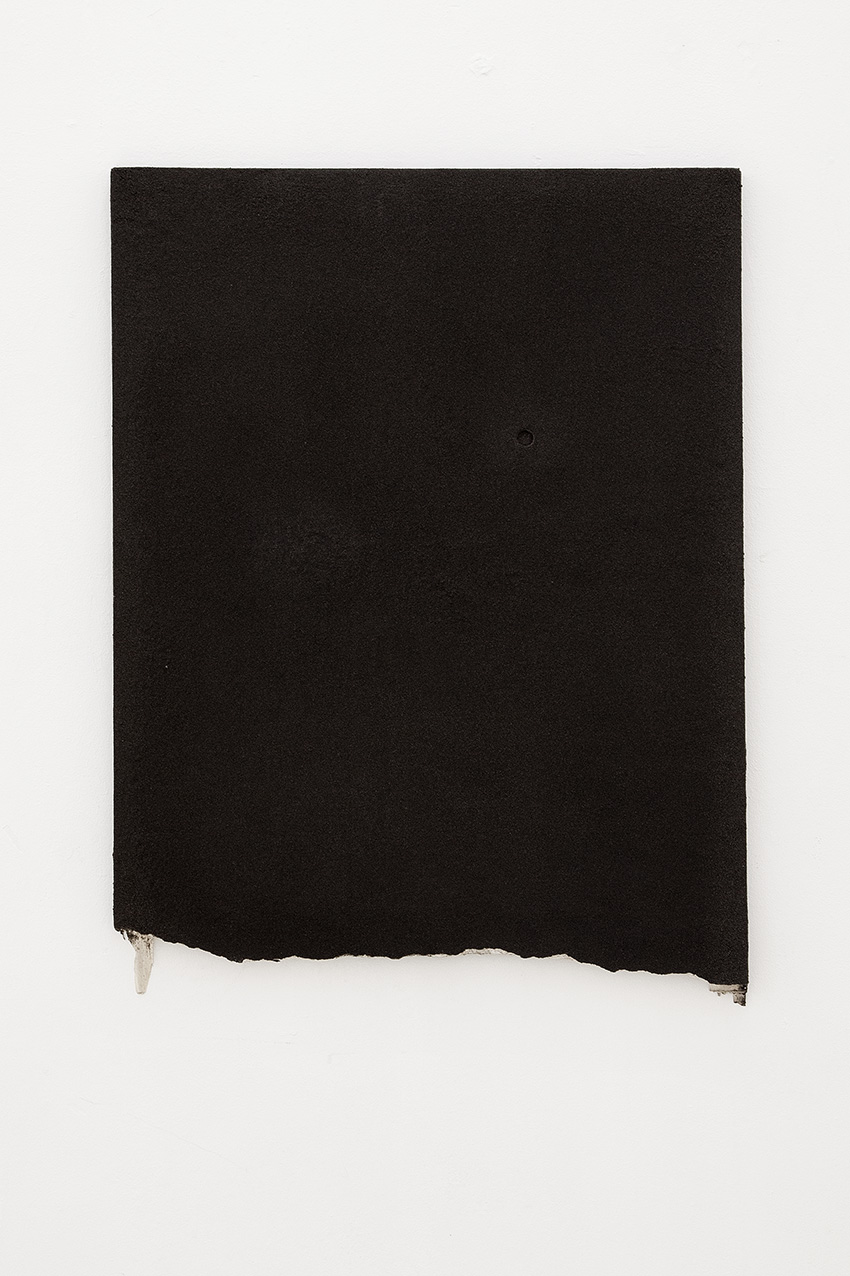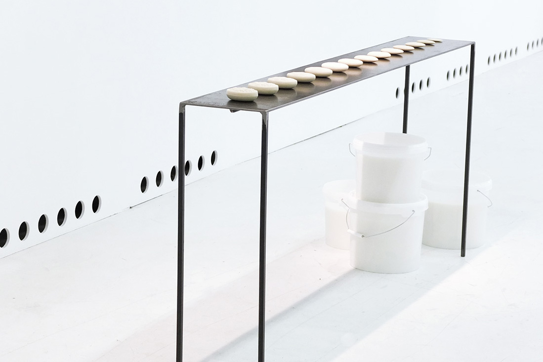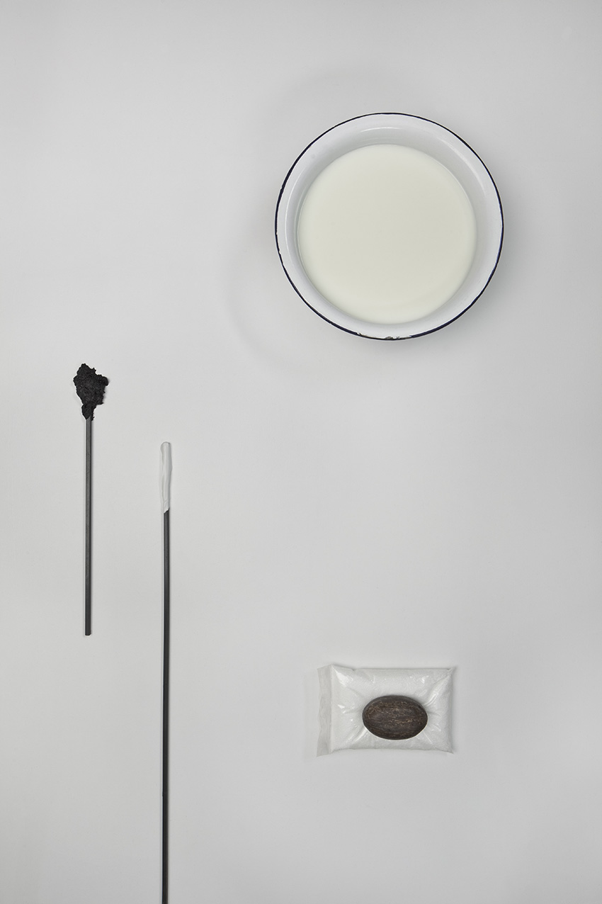 alu dibond, PVC adhesive film, bitumen, wax, karité butter soap, iron, acrylic, milk, enamel basin;