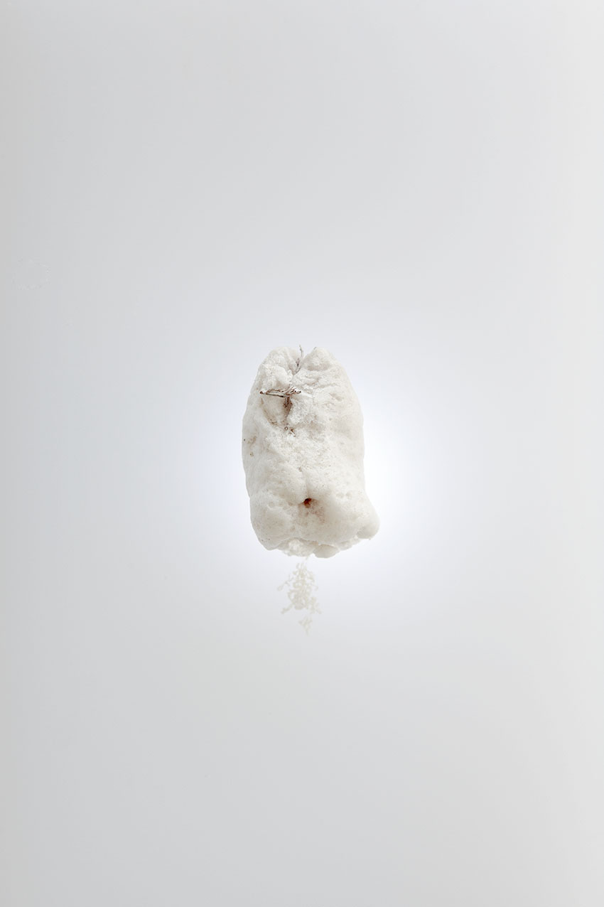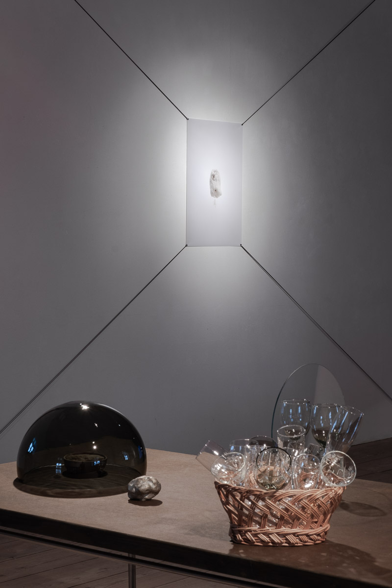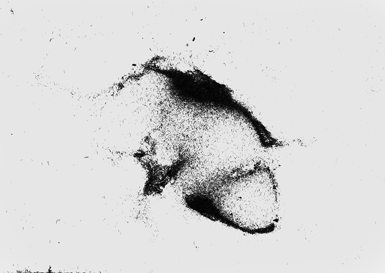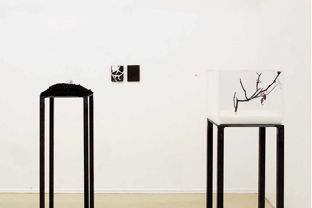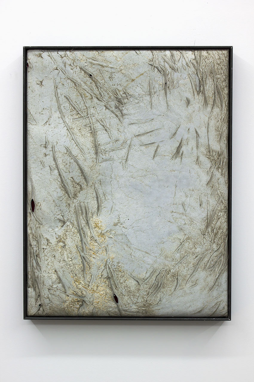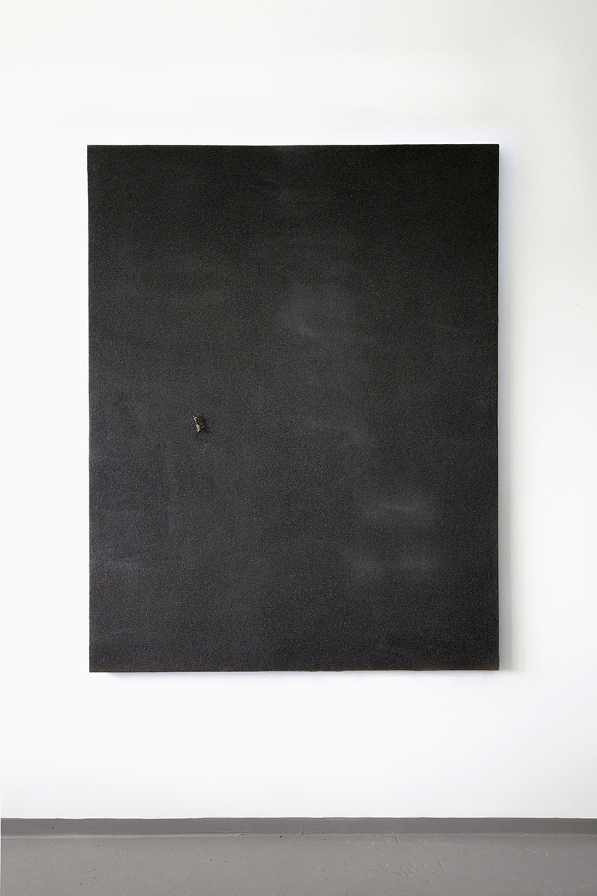 alu dibond, PVC adhesive film, bitumen, wax, karité butter soap, iron, acrylic, milk, enamel basin;