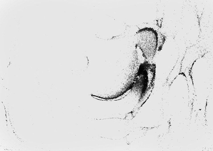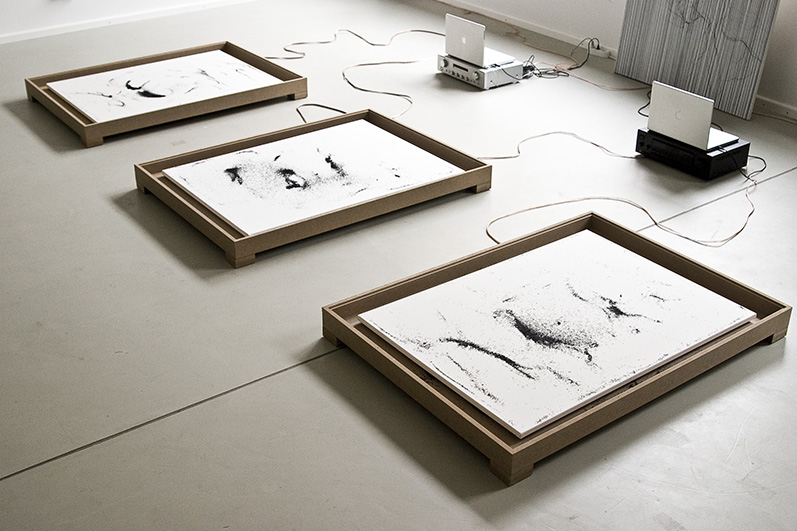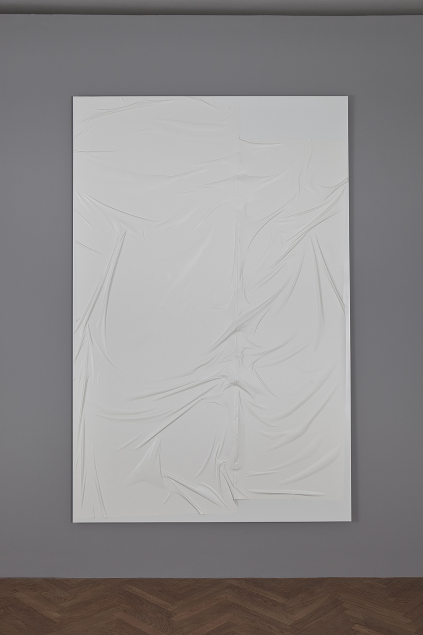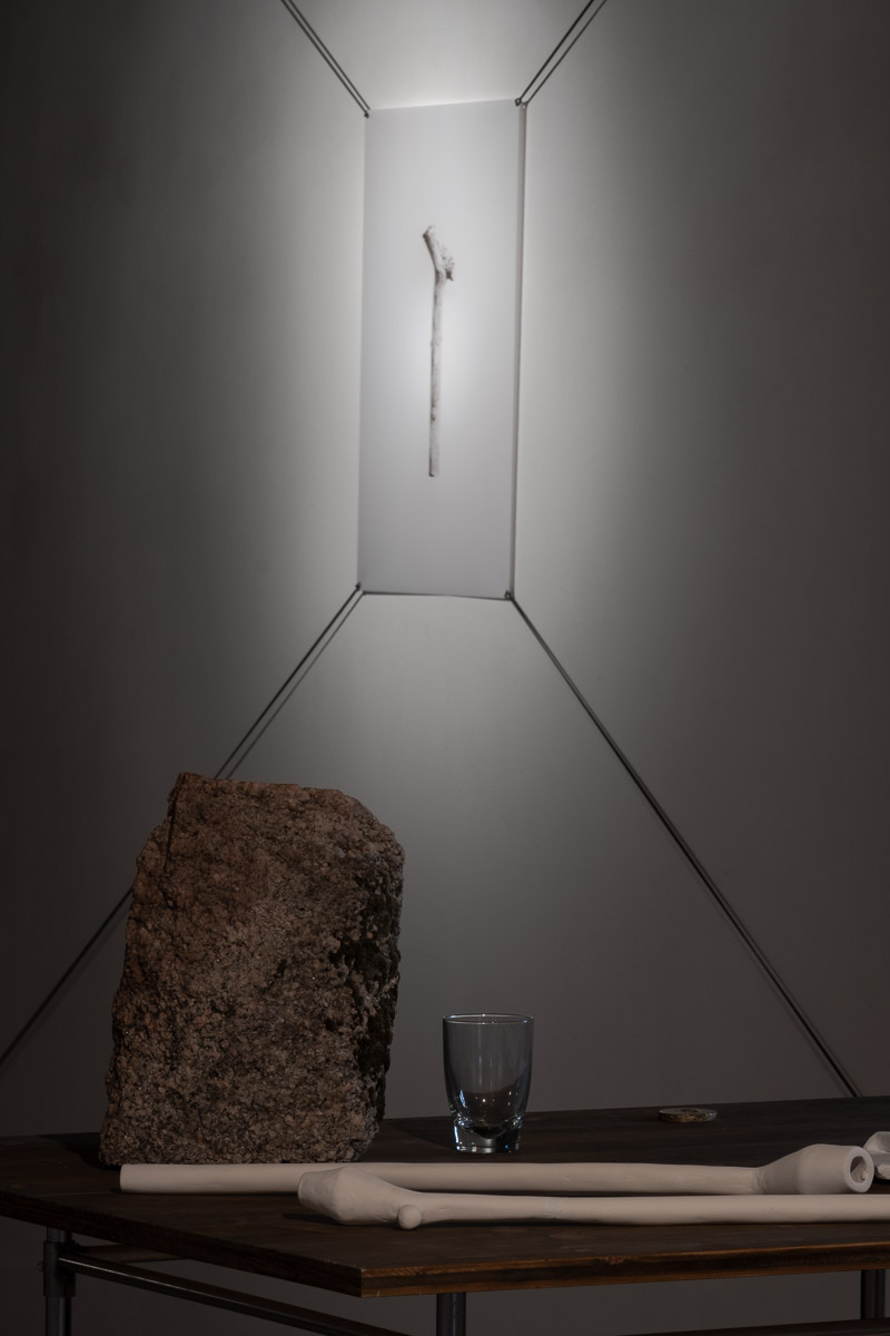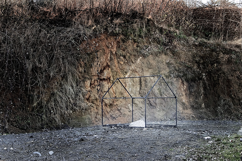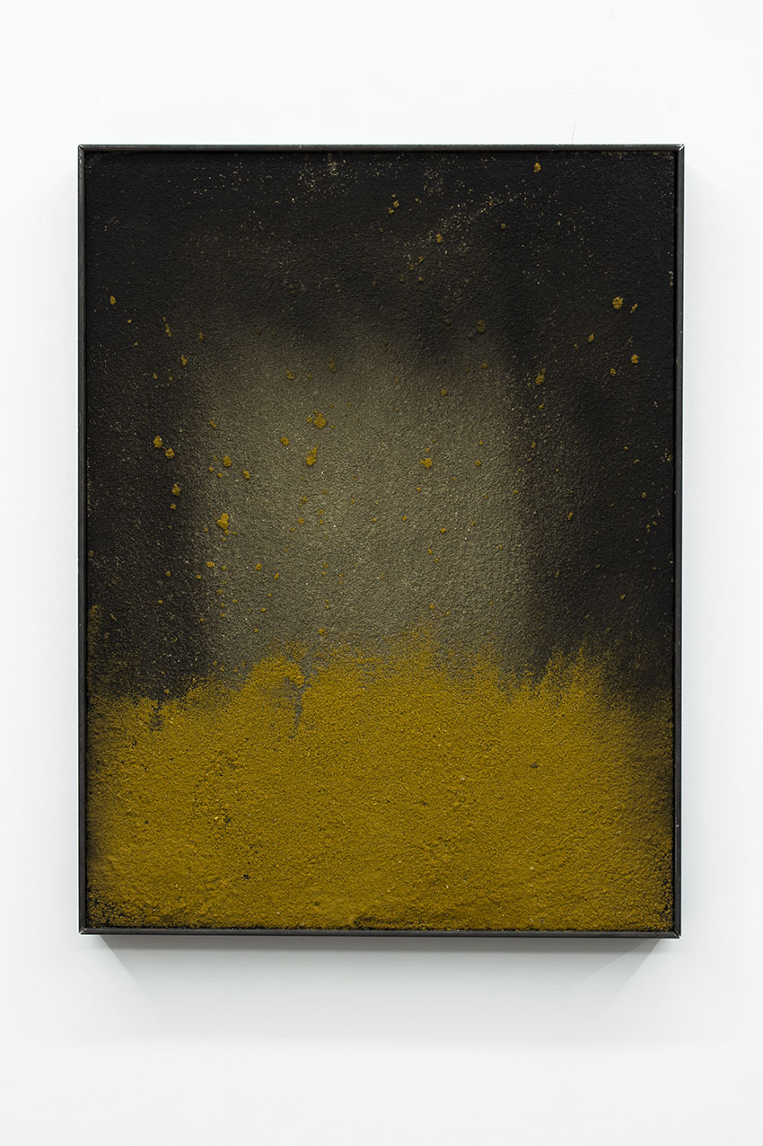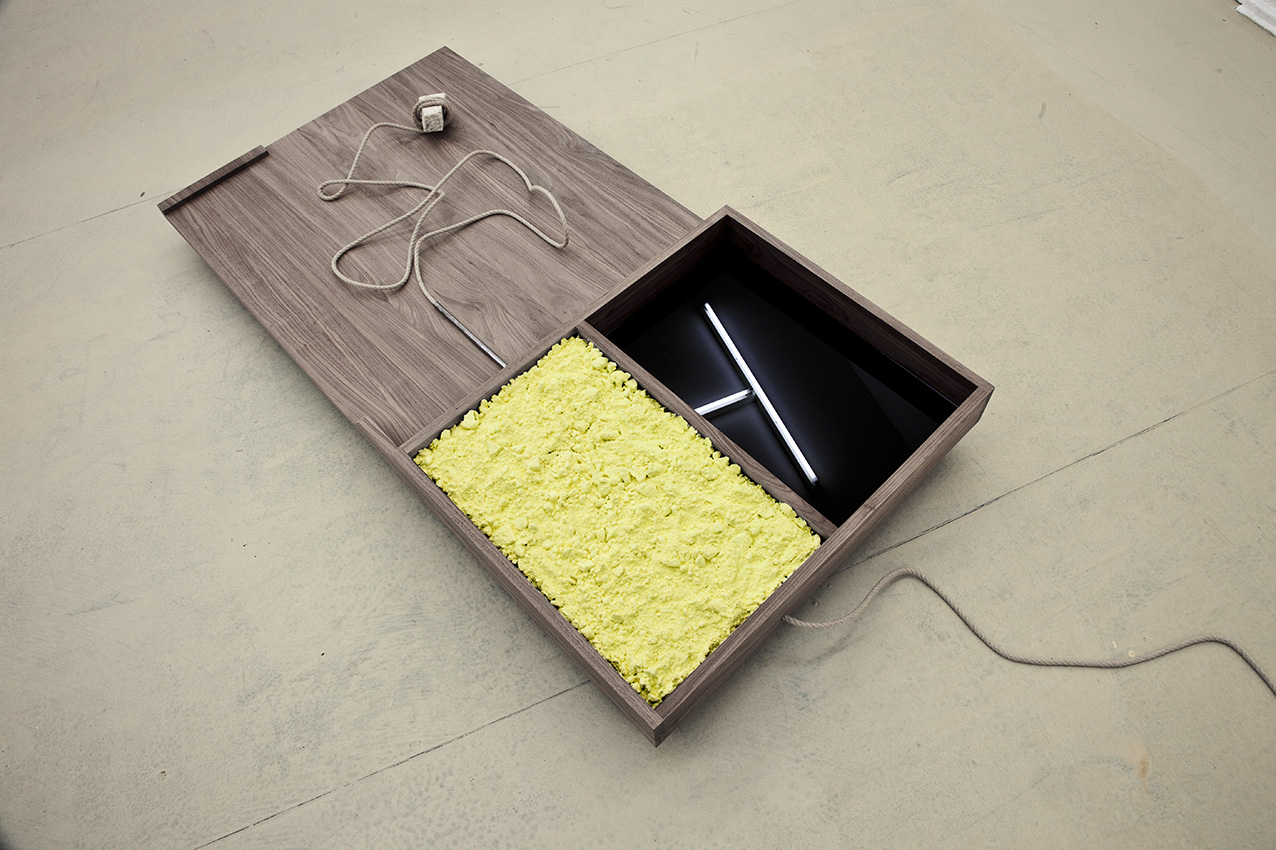 alu dibond, PVC adhesive film, bitumen, wax, karité butter soap, iron, acrylic, milk, enamel basin;