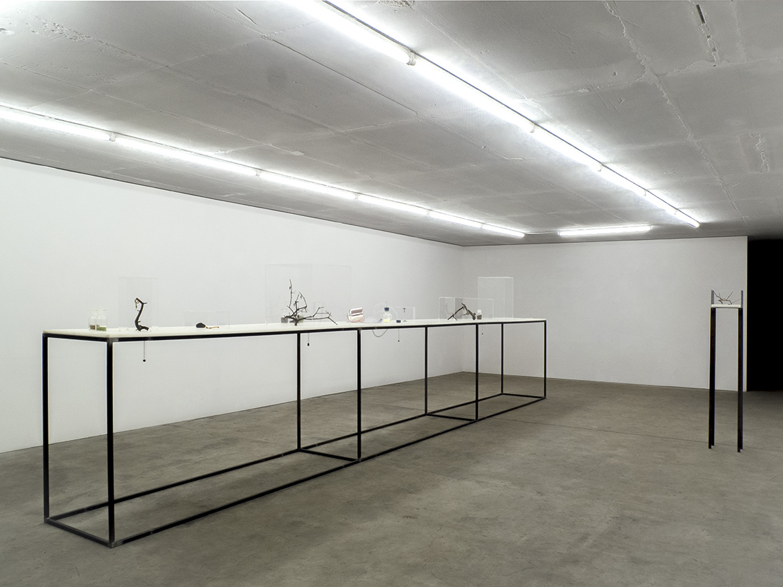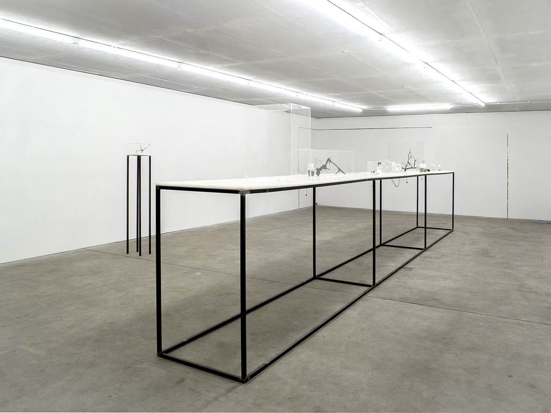 4 glass, water, iron, wood; ca. 13x35x10 cm