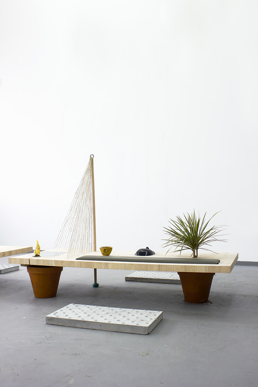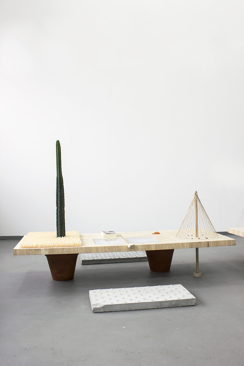 wood, succulents, palm, cord, inkjetprints, manga by Hokusai, clay, pic, foam, plaster, paint, pills, copper, ohtec